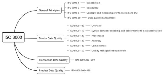 Before ISO 8000 DQ standards were published, a more mature management system of product quality standards existed—ISO 9000 [86]. Initially published by the ISO in 1987 and refined several times, the ISO 9000 family of standards was designed to help organizations ensure that they meet the needs of their customers and other stakeholders while meeting the legal and regulatory requirements associated with their products. It is a general requirement and guide for quality management that helps organizations to effectively implement and operate a quality management system. While ISO 9000 is concerned with product quality, ISO 8000 is focused on DQ. ISO 8000 is designed to improve data-based quality management systems, a standard that addresses the gap between ISO 9000 standards and data products [87].
