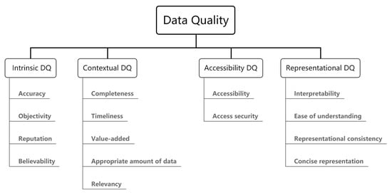 DQ research and practices can be categorized into top–down and bottom–up approaches [48]. The top–down approach usually proposes a DQ framework with DQ dimensions, and then by integrating with specific requirements in the application, more detailed DQ dimensions are constructed, while the bottom–up approach starts by refining a series of DQ dimensions from specific requirements, and through the demonstration of practical applications, the DQ framework is finally generalized.