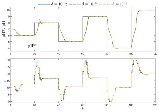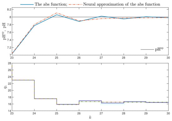 In this work, the neutralisation reactor is used as a benchmark to evaluate and compare all considered MPC methods. The process has one manipulated variable, which is a base () stream (mL/s) and one controlled variable, which is the value of pH of the product. The detailed fundamental model of the process is given in [66]. The process is nonlinear, since its static and dynamic properties depend on the operating point. Hence, it is frequently used as a good benchmark to evaluate model identification algorithms and advanced nonlinear control methods.