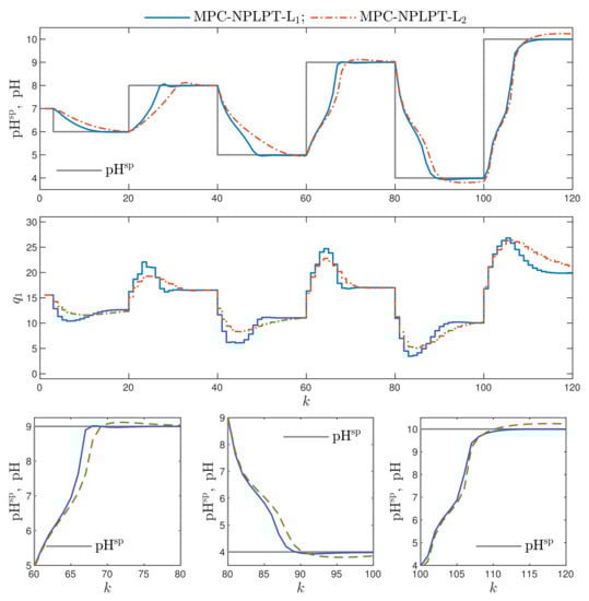 Finally, let us compare the results of the MPC-NPLPT-L and MPC-NPLPT-L algorithms when the penalty coefficient is increased. In our study, the value is considered. Figure 9 presents the obtained trajectories. Two top panels show the results for the whole simulation scenario, whereas the bottom ones show enlarged fragments for three set-point changes. It is interesting to see an additional advantage of the recommended L norm because, in such a case, the overshoot is much lower and the setting time is much shorter when compared with the trajectories possible when the classical L norm is used. In the considered comparison, for , the benefits of using the L norm are even more clear than in the case of the default value of the penalty coefficient, i.e., , as presented in Figure 8.