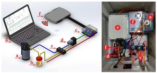 Schematic of an artificial olfactory (e-nose) system, the components of this system consist of the following parts (listed in order and direction of airflow as follows). (a) Air filter (activated charcoal to remove ambient-air VOC hydrocarbons), (b) sample headspace chamber, (c) solenoid air valves, (d) diaphragm pump, (e) e-nose sensor array chamber, (f) data acquisition recorder and wireless transmission card, and (g) personal computer (PC). Adapted from ref. [22].