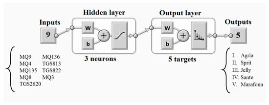 Diagrams of the two-layer feedforward models with a tan-sigmoid function in the hidden layer and a Softmax function in the output layer for electronic nose inputs. Abbreviations: W: weights; b: bias. Adapted from ref. [32].