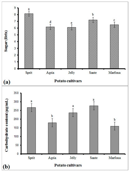 In addition, the average potato carbohydrates’ content in potato cultivars can be seen in Figure 3b. According to the results, the highest carbohydrate content was observed in Sprite, Sante, and Jelly cultivars equal to 277, 266, and 237 μg/mL, respectively. However, the least carbohydrate content was recorded for Marfona and Agria cultivars.