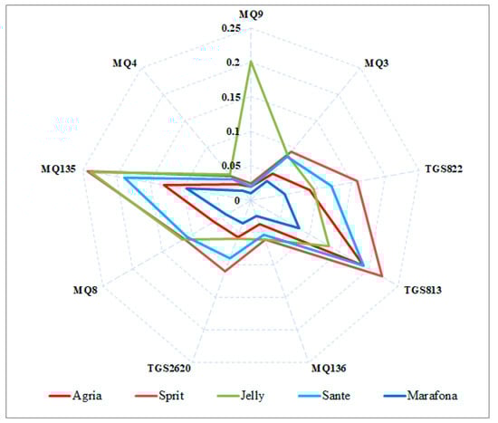 The experiments were performed to identify five different potato cultivars. Radar diagrams were used to observe the differences in patterns (fingerprints) between different potato cultivars. The average output data of electronic nose sensors, during 100 s of measurements, are plotted as a radar diagram following the normalization using Equation (1) (Figure 4). Using this diagram, it is possible to visualize the difference between the response patterns of the sensors to the odor of each potato cultivar. As can be seen from Figure 3, there is considerable similarity in the fingerprints of different potato cultivars. Except for the Jelly cultivar, whose pattern is somewhat different from other cultivars, all other cultivars have almost the same pattern but are varied in values. Accordingly, the highest odor is related to Jelly, Sprite, and Sante cultivars. These three cultivars also have the highest carbohydrate content. It can probably be said that the reason for the greater odor of these three cultivars is due to their higher carbohydrate content.