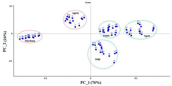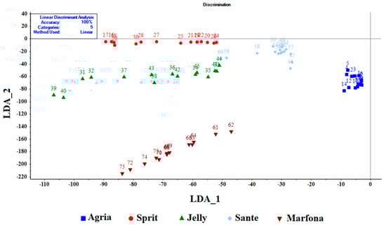 The scores diagram (Figure 5) shows the total variance of the data equal to PC-1 (76%) and PC-2 (16%), respectively, with the first two principal components, constitute 92% of the total variance of the normalized data. When the total variance is above 60%, it means that the first two PCs are sufficient to explain the total variance of the dataset. According to the figure, the three cultivars Gelly, Sprite, and Sante, with higher carbohydrate contents, can be seen on the right side of the score diagram, and the two cultivars, Marfona and Agria, can be seen on the left side of this diagram. It can be assumed that the e-Nose has a good response to the odor of carbohydrates, and it may be possible to distinguish different potato cultivars only based on their carbohydrate contents. It indicates the high accuracy of the electronic nose in detecting the odor of different products.