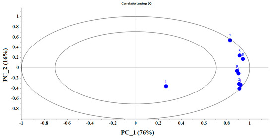Loading plot for PCA analysis to identify five different potato cultivars. Abbreviations: (1) MQ9, (2) MQ4, (3) MQ135, (4) MQ8, (5) TGS2620, (6) MQ136, (7) TGS813, (8) TGS822, and (9) MQ3.