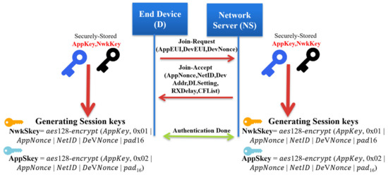 The end devices communicate with the network server to start the network joining procedure. In [26], the activation mode is used when the end device is initially deployed. Initially, each end device is configured with root keys (NwkKey, AppKey), which are configured by the manufacturer. The network key (NwkKey) and the application key (AppKey) allow the end device to derive the future communication session keys.