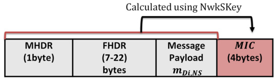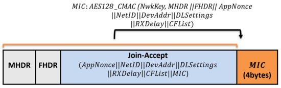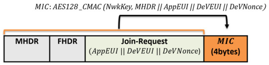 The NwkKey is the network root key previously preshared between the end node and the network server (configured by the manufacturers or at commissioning). The Join-Request message format is shown in Figure 3.