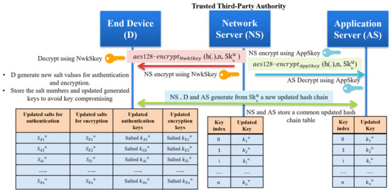 - The network server (NS) securely shares the key material message that consists of (one-way hash function h(.), the length n of the chain, the master secret seed Skn to generate the chain);