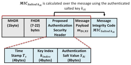 The end device picks a salted authentication key from the salted key table to generate a message integrity code over a data message m, where is the original key, and is the salted value. The authentication procedure is described through Equations (4)–(6).