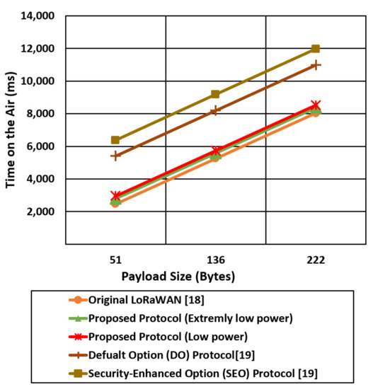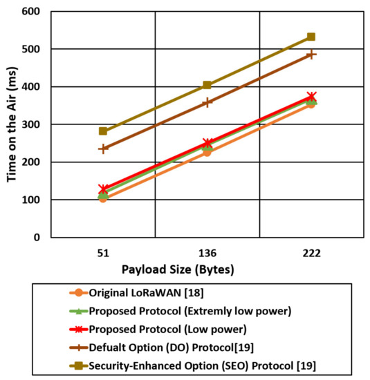 Figure 18 shows the time on the air comparison for the proposed security cases (low power, extremely low power) and the other LoRaWAN protocols (original, Do, SEO) using an SF of 7. The spread factor value of 7 allows the end devices to reduce the time on the air and save the power consumption compared with spread factor 12. The LoRaWAN original protocol experiences the lowest time on the air compared with the other protocols since the total security overhead for the LoRaWAN is 4 bytes. The proposed extremely low power case reduced the time on the air by two times compared with the SEO case. The end devices in SEO use a complex and expensive elliptic curve to provide authentication that introduces high power consumption and high time on the air.