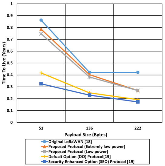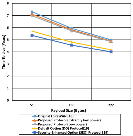 Figure 19 compares the battery life in years of the proposed protocol in two cases and the other mentioned protocols for different payload sizes (51,136,222) bytes using the worst-case environment parameters (SF of 12). The battery life (Time To Live) is decreased dramatically with the increase of the payload size; for the LoRaWAN protocol, the TTL of an end device is 0.88 years for a payload size of 51 bytes, compared with 0.72 years and 0.78 years for the proposed protocol cases (low power, extremely low power), respectively. In contrast, for a payload size of 222 bytes, the TTL for LoRaWAN is decreased from 0.88 to 0.29 years, and for the proposed protocol is decreased from 0.72, 0.78 to 0.27, 0.28 for the low power case and extremely low power case, respectively. The proposed protocol for the extremely low power case enhances the battery life of the end devices by two times over the SEO protocol for a payload size of 222 bytes due to using a negligible hash chain key generation compared with the digital certificate authentication that is used in the SEO protocol.