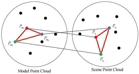 For a solid object, at least three corresponding points are required to estimate the transformation matrix between the model and scene point cloud. It is not easy to find the correct match due to similarities in different key points and uncertainties in the point clouds. Although the number of keypoints is fewer than the original point cloud, the search space is still large. Assume there are M model key points and N scene keypoints, and, for each model keypoint, K candidates are considered; the total search space is , which is 125,000, even with 10 keypoints and 5 candidates.