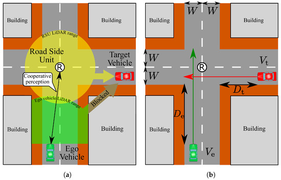 Since this analysis focuses on the relation between the performance of wireless communication and safe crossing, first of all, the current status of V2X communications is introduced in this section. As expected, wireless technology is a core factor of cooperative perception and the current candidates of wireless technology for cooperative perception are dedicated short-range communications (DSRC) and C-V2X. DSRC is natively designed to support vehicular networks so that it can communicate with high-mobility devices. However, the performance of DSRC rapidly degrades with high-density traffic. C-V2X makes a new channel that is called a sidelink channel for the absence of cellular infrastructure [37]. Sidelink channels enable vehicles to directly communicate through the PC5 interface and there are two modes that are called mode 3 and mode 4 in the sidelink channels. Mode 3 can be used in eNodeB (evolved node base station) coverage and eNodeB reserves resources. Mode 4 is made for the outside of eNodeB coverage and user equipment (UE) autonomously reserves resources. However, when traffic density increases, the performance of C-V2X degrades as that of DSRC [38]. In [39], the authors performed the experiment and compared the communication performance of IEEE 802.11p, which is one of DSRC and LTE-V, and showed that an RSU that transfers V2V messages improves the communication performance.
