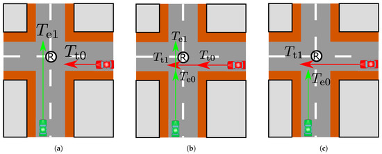 In order to realize a safe and efficient crossing, the emergency cases where braking is necessary to prevent the collision should be specified in advance [32]. Moreover, this analysis helps to determine a required recognition range to prevent a traffic accident. Since driving at constant velocity is assumed, we can specify the collision cases by considering an arrival time and a leaving time at the intersection that depend on the initial positions of the vehicles. Therefore, we classified the collision cases and the other cases by these time parameters as Figure 2. Figure 2a (Figure 2c) is the driving pattern that the ego (target) vehicle first passes through the intersection. () is the time for the ego (target) vehicle to arrive at the intersection. () is the time for the ego (target) vehicle to leave the intersection. In the case of Figure 2a (Figure 2c), the relation of the time parameters is (). On the other hand, Figure 2b represents the driving pattern through which the collision occurs and the relations of time parameters are . From the above classification, braking is only needed in the Figure 2b case.