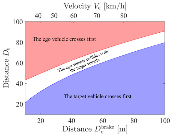 Using the simplified inequalities, the three driving patterns with comfortable braking under km/h can be visualized, as shown in Figure 3. Notice that and have the relation of Equation (3), which are shown by the axis and axis in the figure. Since is related to both the braking distance and the performance of wireless communications, we use superscript to show the main role of in each analysis. Figure 3 shows the relation between the driving patterns and the initial locations of the ego vehicle and the target vehicle under the fixed velocity of the target vehicle. Namely, when the ego vehicle placed at starts to drive at the corresponding , the decision making of the ego vehicle depends on the location and velocity of the target vehicle. When the initial location obtains very small (large) under fixed , the target vehicle (the ego vehicle) passes through the intersection first so that it does not have to apply the brakes, which corresponds to the blue (red) area. On the other hand, when the distance and the velocity parameters of the ego and the target vehicle meet Equations (1) and (2), the collision occurs at the intersection, which corresponds to the white area. Therefore, when the parameters of the ego and the target vehicle belong to the white area, the ego vehicle has to perform comfortable braking to prevent the collision and stop in front of the intersection.
