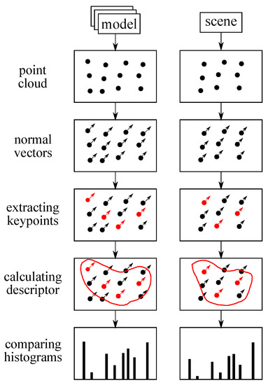 The object recognition starts from preparing a clustered point cloud. In this analysis, all points obtained by ray-trace simulation have a tag that tells which objects each point is on. By collecting points on the target vehicle, ideal clustering can be performed. The next process is the calculation of a normal vector for each point to calculate the CVFH. After preparing the clustered point cloud with normal vectors, keypoints are extracted from the clustered point cloud. In PCL, keypoints are explained as points that are stable, distinctive, and can be identified by using a well-defined detection criterion. The main advantage of using keypoints is that selecting points from the clustered points reduces the calculation time. Actually, instead of using keypoints modules, a voxel grid filter is often used to just reduce the number of points for convenience. The extracted keypoints were used to calculate CVFH and the calculation output histogram data. Finally, histograms calculated from the scene and the model point cloud are compared and the object and direction recognition is performed by choosing the nearest histogram. Since a large part of sensor data are obtained from the RSU, the histograms are made from the viewpoint of the RSU.