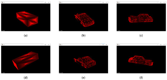 Examples of model point cloud data: (a) Model data of the front of the rectangular model. (b) Model data of the front of the vehicle. (c) Model data of the left of the vehicle. (d) Model data of the side of the rectangular model. (e) Model data of the rear of the vehicle. (f) Model data of the right of the vehicle.