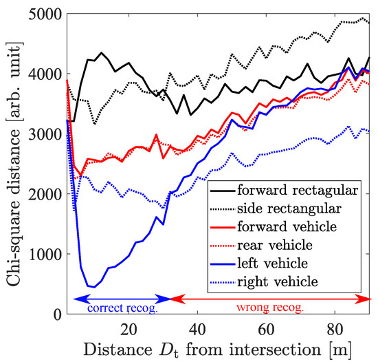 Figure 6 shows examples of the transition of chi-square distance between the model histogram and the obtained histogram. The transition of chi-square distance without cooperative perception is omitted because the buildings block almost all lasers from the LiDAR sensor on the ego vehicle to the target vehicle. In this scenario, when the ego vehicle recognizes the obtained point cloud as the left side of the vehicle shown in Figure 5c, the ego vehicle recognizes the correct traffic environment, which will lead to the correct braking decision. This is because all LiDAR sensor data are transformed into the ego vehicle coordinate as introduced in Section 3.1 and the left side of the target vehicle can be visualized from the ego vehicle under the intersection with no obstacles. From the figure, when the ego vehicle uses cooperative perception, it correctly recognizes the target vehicle in the range from to 32 m. Since the LiDAR sensor on the RSU does not see directly below the RSU, the recognition range does not start from 0 m.