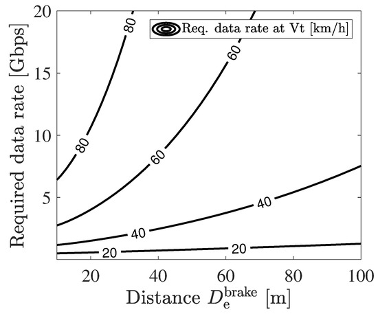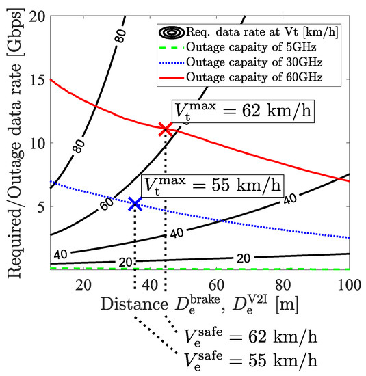 Figure 11 shows the result of the simulation and Table 1 shows the parameters used in this simulation. The x axis describes which relates to the braking distance and the outage capacity of the V2I communication. The contour plot shows the required sensor data rate as same as the plot in Figure 7. The red, blue, and green lines show the realized outage capacity using 60, 30, and 5 GHz V2I communication.