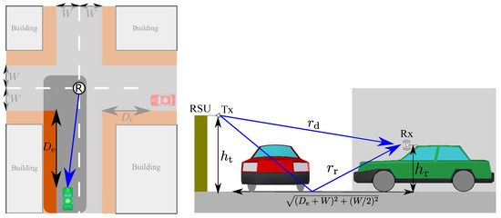 From the above introduction, we can see that there are many candidates for wireless communication systems. Therefore, we compared the cooperative perception for safe crossing realized by the candidates. The analysis was performed by comparing the sensor data rate and outage capacity calculated by the assumed channel model. In general, there are deterministic path loss models, statistical models, tapped delay line models, and geometry-based stochastic models to describe channel models for the 5.9 GHz frequency band [43]. In [44], the authors used a two-ray ground reflection model to compare V2I measurements in the 5.9 GHz frequency band. The results show that the model can properly represent the received power in LOS and NLOS environments. In [45], the authors analyzed millimeter-wave V2I communications and showed that a two-ray channel model well represents millimeter-wave communications with highly directional antennas. Considering the above works, we also assumed the V2I propagation model as a two-ray ground reflection model that is one of the deterministic path loss models, which will reduce calculation time.