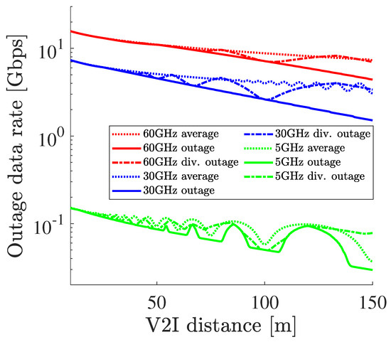 This height diversity performance difference can be discussed from two aspects. The first aspect is the antenna vibration that causes a dynamic change in phase difference. Since no vibration at the receiver is assumed, a large phase difference between the direct path and the reflected path rarely occurs so that the improvement becomes smaller. The second aspect is the beamwidth of the antenna. Since millimeter-wave communications have a large path loss, its antenna needs strong directivity to realize long-range communications. In [46,47], a narrow beamwidth such as 10 degrees is used for the outdoor measurement of millimeter-wave communications. On the other hand, the narrow beamwidth was also adopted in our analysis to not only realize long-range communication but also utilize spatial diversity, or spatial channel reuse, in dense traffic. Using such a narrow beamwidth in V2I communication, the difference in the angle of departure between the direct path and the reflected path becomes large so that the reflected path does not depart from the high gain of the main lobe. Therefore, the effect of the destructive interference becomes small due to the small power of the reflected wave. However, the effect of the constructive interference also becomes small so that the outage capacity does not rapidly decrease.