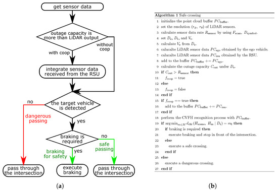 Description of the whole process in the simulation: (a) Block diagram of a safe crossing. (b) Algorithm of a safe crossing.