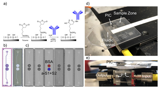 Once received from the foundry, chips were then functionalized to sense SARS-CoV-2 spike protein and anti-SARS-CoV-2 antibodies. First, chips were cleaned with a 50/50 mixture of methanol and hydrochloric acid, rinsed 3x with Nanopure water, and dried with nitrogen. Then they were incubated for 40 min in 1% 3-(triethoxysilyl)propyl succinic anhydride (Gelest, Morrisville, PA, USA) in anhydrous toluene, rinsed for 5 min in pure anhydrous toluene, dried with a stream of nitrogen, and heated at 110 °C for 30 min to allow complete annealing of the functional monolayer and to evaporate any residual toluene. A schematic of the functional chemistry is shown in Figure 1a.