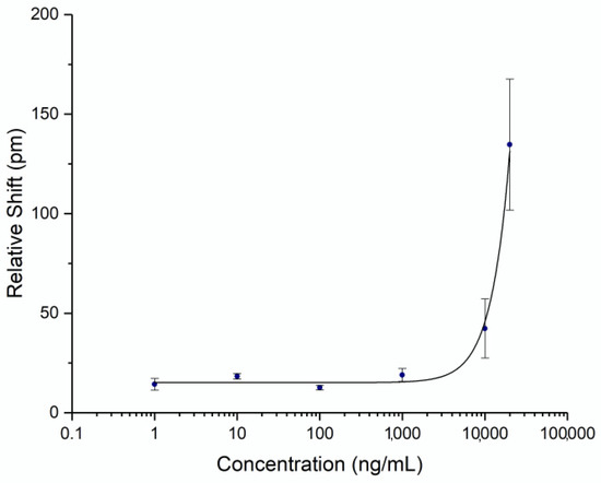 Additionally, each sample was assayed for the presence of anti-SARS-CoV-2 antibodies to track the time course of antibody production following vaccination. This response has been well-documented throughout the clinical trials of both mRNA vaccines [1,14] and in our previous work [11]. The pattern we see here is similar, with a modest increase in the first three weeks and a significant boost after the second dose for most subjects. The 3 min shift seen for anti-RBD antibodies ranged from about 75 to 600 pm. A response curve was not generated for antibodies since antibody concentration after vaccination has been well documented. However, due to the similar sizes of antibodies and whole spike protein (~150 kDa for antibodies and 134.6 kDa for S1 + S2), the higher photonic response for antibodies can be attributed to a much higher concentration of circulating antibodies. This is in agreement with our previous study documenting anti-RBD antibodies in convalescent COVID-19 patients, which had antibody concentrations of about 1–150 μg/mL as measured by ELISA, corresponding with photonic resonance shifts of about 50–600 pm [11].