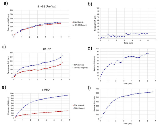 Representative traces for spike-positive, as well as a pre-vaccination negative control and anti-RBD-positive serum samples are shown in Figure 4. Raw spectra (Figure 2) were analyzed with a Python script described previously [11] and then converted to shifts relative to the position of resonances at time = 0 for both control and experimental rings (Figure 4a,c,e) and relative (BSA ring-subtracted) shift (Figure 4b,d,f). The control ring will shift only as a result of bulk refractive index changes in the sample, temperature fluctuations, and non-specific binding. Thus, the subtracted curve yields an accurate representation of specific antibody/antigen binding over the course of the assay.