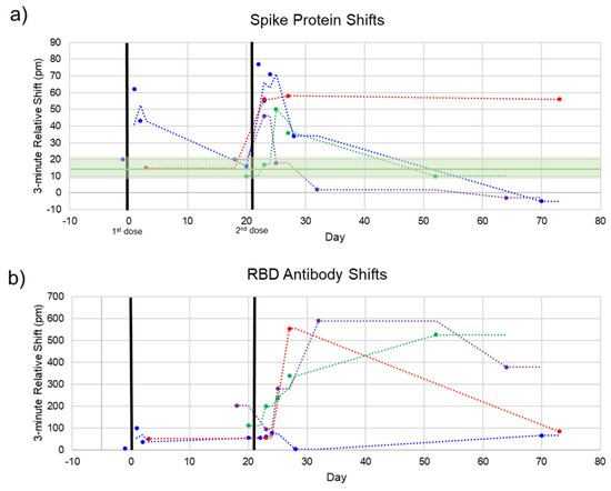The photonic response data for spike protein is plotted against time in Figure 5, with the two doses marked at Days 0 and 21. The relative shift at 3 min ranged from –5 to 78 pm. Pre-vaccination samples (n = 4) were run to determine the noise of the assay, yielding an average relative shift of 15 pm (95% confidence interval 8.8–21.2 pm), shown as the green line and shaded region in Figure 5a. According to the calibration curve in Figure 3, this corresponds to a maximum concentration of 14.6 μg/mL. Recently published work by Ogata et al. used a Quanterix assay measured spike protein in the blood at concentrations less than 50 pg/mL on a similar timescale [10]. The large discrepancy between our photonic assay and the Ogata work was intriguing and may reflect the early stage of knowledge in this area. While our calibration data were derived from commercial S1 + S2 ECD protein, the protein produced in vivo following BNT162b2 vaccination was prefusion stabilized, membrane-anchored SARS-CoV-2 full-length spike protein [1]. As such, the capture of this protein could bring with it membrane components that would produce a signal in a label-free assay such as ours, but not in a labeled assay. Further differences in structure between commercial and host-generated spikes could result in the quantitative differences observed in this study. Across the four subjects, we observed that there were differences in terms of maximum concentration, time at which the protein concentration peaked, and the time for spike protein to be completely cleared from the blood. Still, the clear trend was a rapid increase in spike protein immediately (1–3 days) after each injection, returning to a baseline level in less than a month. This was in good agreement with the time course reported by Ogata et al.