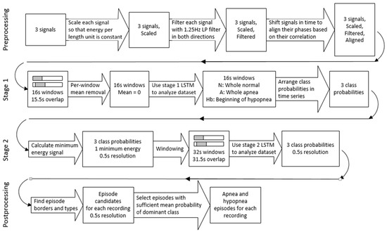 40]. It also uses LSTM networks to deliver class probabilities, but there is no postprocessing stage. The other algorithm differs from the one described in that it uses slightly different set of signals—most notably SpO