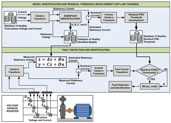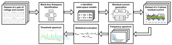 A novel framework is proposed to improve the effectiveness of frequency-domain fault identification against noise and input voltage quality interference. The improvement relies on the utilization of the residual current signal instead of the current signal in the frequency-domain analysis. The proposed method considers the relationship between the input voltage and the output current through the identified IM model. The residual signal is obtained from the subtraction of the measured output current and the estimated current signal from the identified IM model. Thus, this method is also called MFDI. MFDI is an FDI approach based on the analytical redundancy in which a mathematical model of the system is utilized with some estimation/identification techniques to generate the estimated system output and obtaining the residual of the system output []. Generally, the MFDI process consists of system identification/parameter estimation, residual generation, and residual evaluation [,]. MFDI relies on the accuracy of the system model description so that the fault indication can be achieved from the residual of the system output. The system model itself can be obtained through the derivation of the first principle and data-driven identification [,].