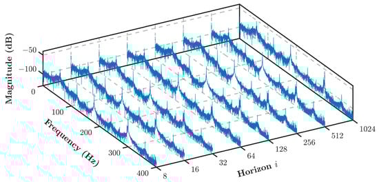 One of the requirements to implement Algorithm 1, a horizon i must be selected accordingly. Ref. [] states that horizon i must be selected as , with n as the state-space order. As the IM is assumed to be in a quasi-steady-state with a constant speed, the IM is described to be a fourth-order system () in this study. Several iterations to select an appropriate horizon i were performed. The selection categories are set to be computational time to perform the identification and the level of . As it is presented in Table 1, the computational time varies a lot with tiny variations in the level. Selecting will have almost 0.5% better than . Nevertheless, it has a trade-off of 0.1 seconds computational time. Selecting will increase the level. Since the amount of data for the analysis is quite large, and considering computational time and acceptable level, the horizon was selected to be . Another reason is that the residual spectrum of these various horizons does not show much difference, as shown in Figure 2.