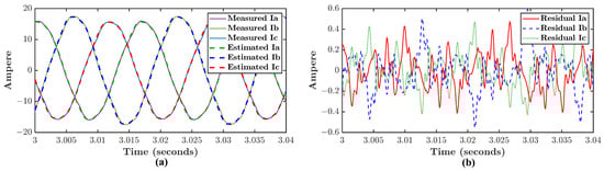 Three-phase signal of (a) measured and estimated current (b) residual current.