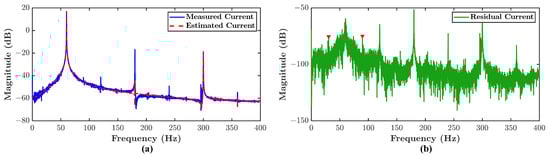 where is the estimated current signal, is the residual current signal, is the residual signal amplitudes, is the residual frequency, and i is an integer value correspond to the residual frequency index with K indexes length. Now, the so-called residual frequency corresponds to residual harmonic, fault, and measurement noise frequency components where their presence may overlap each other. The frequency spectrum of Equations (1) and (3) can be obtained by applying the FFT algorithm where it is based on this following Discrete Fourier Transform (DFT) [],