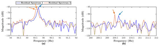 Fault signature peak of two different residual spectrum at (a) (b) .