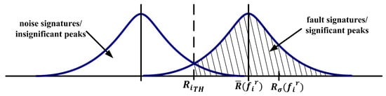 Ideally, in the case of healthy IM, the Binary_mat in Equation (37) has only 0 s as its elements due to the residual spectrum must be less than the threshold. However, in the actual application, there are 1 s as its elements due to noise signatures/insignificant peaks occurred higher than the threshold. This condition occurs in faulty IM as well in Equation (38). Some 1 s that may not be associated with any fault signature. Thus, to determine whether 1 s belong to any specific fault signature or just belonged to random noise bands/insignificant peaks, an evaluation based on the probability distribution of fault and noise signatures is shown in Figure 7 must be done. The shaded area in Figure 7 represents the probability of fault signature/significant peaks, and the white areas represent the probability of noise signatures/insignificant peaks. The probability of fault or noise signatures can be calculated statistically through the Q-function as follows,