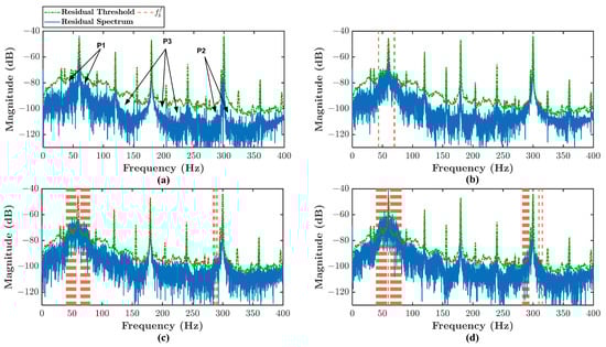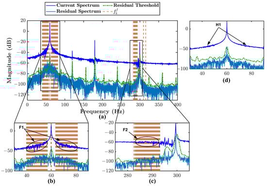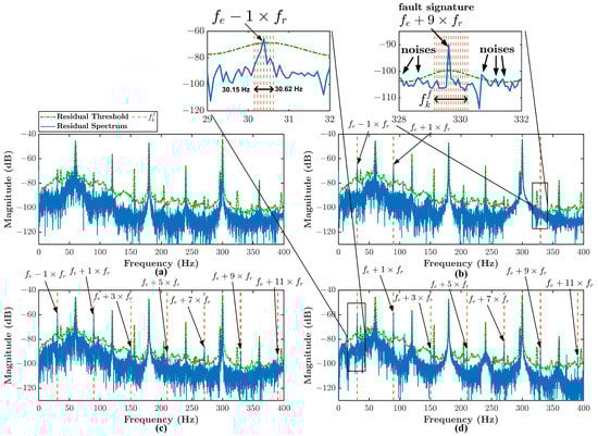 Based on Table 4, it can be seen that at fault signature , there are three frequencies related to this signature because of the frequency offset phenomenon. They are identified as 30.31 Hz, 30.39 Hz, and 30.46 Hz. The fault signature suppose to appear at 30.35 Hz, but the frequency is offset in three different frequencies. Hence, through Equations (42)–(44), the fault frequency band for fault signature is identified between 30.15 to 30.62 Hz. This fault band can be seen in zoomed-in fault signature in Figure 10d. Any fault characteristic frequency that occurs inside this band and is higher than the residual threshold will be considered the fault signature . A similar explanation applies to the other fault signatures presented in Table 4.