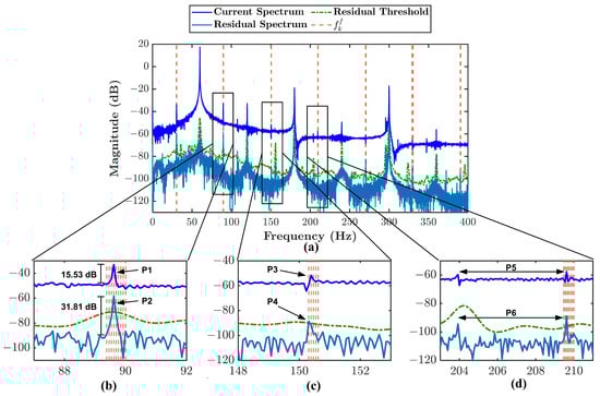 Another advantage of residual spectrum is presented in Figure 11d. P5 points to identical signatures in the current spectrum, P6 points to the same signature in the residual spectrum. It is difficult to determine whether the first peak will also be considered a fault signature in the current spectrum. It is also difficult to evaluate whether it contributes to the fault severity. Nevertheless, using the proposed method, the first peak is not considered a fault signature since it simply lies outside the fault band and is lower than the threshold. Then, there is no contribution for that peak in fault severity. It proves that the proposed method can avoid false signature identification.