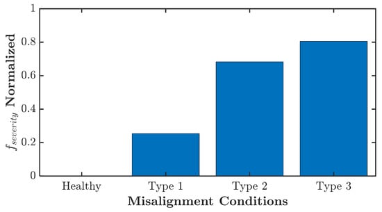 Figure 12 shows the results of normalized fault severity evaluation. The fault severity is evaluated by using Equation (45), and technically, it is a summation of the energy of the identified fault frequencies. A mean value is calculated from 30 data in each condition. Since there is no fault signature identified in the healthy condition, no energy can be summed. Therefore, it indicates zero levels of fault severity. The normalized fault severity is highly dependent on the user-defined level. It depends on how the user will allow the IM to run in such a faulty condition. It is possible to allow the IM to run in more severe misalignment conditions than type 3. Thus, the maximum normalized fault severity level will be higher. However, the idea in Figure 12 is to present the severity evaluation based on the identified fault frequency energy. It provides a quantified severity evaluation.