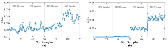 Similar to the misalignment condition, the turbulent flow condition can be observed from the level and the . Figure 13a,b shows the turbulent flow experiment level and respectively. The first three different input openings cannot be distinguished clearly by using the level. However, for 50% opening, it shows higher and distinguishable . In contrast to the level, the two last openings can be distinguished clearly. According to this result, it can be confirmed that the flow turbulence appeared when there is an abrupt change in the input valve openings at 60% and 50%. However, it can be observed more in detail using the residual spectrum of these different input valve openings.