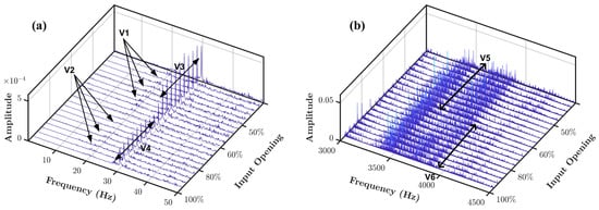 Radial vibration of centrifugal pump in four different input valve openings: (a) frequency band 0 to 50 Hz, (b) frequency band 3000 to 4500 Hz.
