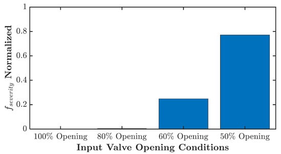 A quantified severity evaluation is presented in Figure 17. It shows that the turbulence severity for 60% opening is much lower than the 50% openings. At the same time, there is zero level fault severity for 100% openings since there is no energy to be summed. This fault severity quantification can help to determine further corrective action for the faulty condition.