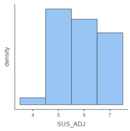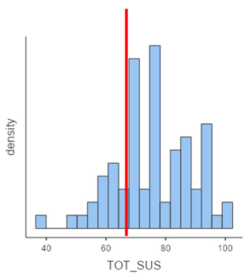 - The usability of the technological instrument by the System Usability Scale (SUS) [28], a short questionnaire composed of ten items (five with a positive value and five with a negative value) on a 5-point scale, from “completely disagree” to “strongly agree”. The score ranges from 0 to 100 and indicates the overall usability of the system. SUS is a valid, reliable, and quick-to-use scale widely used to evaluate the usability of a wide range of technological devices. Furthermore, the scale takes into account two main aspects that affect the user experience: usability, which indicates the ease with which the user uses the system (scores 1–4), and learnability, which represents the ease with which the user learns to use the system (scores 1–4) [29].