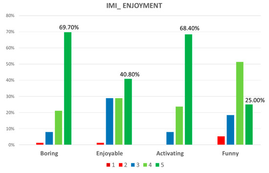 - four items (5-point scale: from low to high) from the subscale enjoyment of the Intrinsic Motivation Inventory (IMI) [31] to evaluate participants’ appreciation of the proposed activity (i.e., boring, pleasant, fun and activating). The item boring scores were reversed to align it with the remaining items; therefore, in the whole scale, a low value in the items reflects a negative perception of the experience with EXIT 360°.