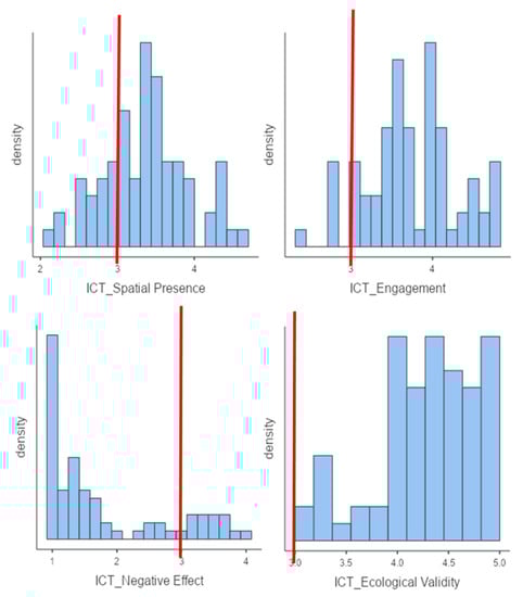 - forty-four items (5-point scale: from 1: “strongly disagree” to 5: “strongly agree”) from the scale Sense of Presence Inventory (ICT-SOPI) to evaluate user’s engagement. Precisely, this questionnaire consists of 44 items divided into four subgroups (each subgroup is generated by calculating a mean of all completed items contributing to each factor): (1) “spatial physical presence”: feeling of being in a physical space in the virtual environment and having control over it (19 items, e.g., “I felt I could interact with the environment shown”); (2) engagement: the tendency to feel psychologically and pleasantly involved in the virtual environment (13 items, e.g., “I was sorry my experience was over”); (3) ecological validity: the tendency to perceive the virtual environment as real (6 items, e.g., “The environment shown seemed natural to me”); and (4) negative effects: adverse psychological reactions (6 items, e.g., “I felt nauseous”). Moreover, ICT-SOPI is divided into two parts: thoughts and feelings after experiencing the environment (Part A) or while the user was experiencing the environment (Part B) [32].