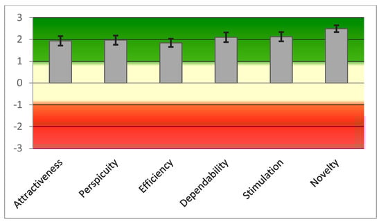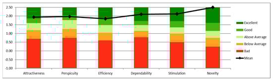 - User Experience Questionnaire, a 26-item scale (semantic differential scale: each item consists of two opposite adjectives, e.g., boring vs. exciting) that allows calculating six different domains: (1) attractiveness (overall impression of the product), (2) perspicuity: easily to learn how to use the product; (3) efficiency (user’s effort to solve tasks); (4) dependability (feeling of control of the interaction); (5) stimulation (motivation to use the product); and (6) novelty: (innovation and creation of product) [33,34,35].
