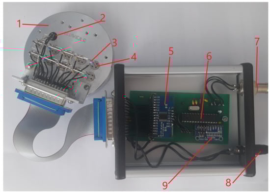 The PW6 electronic nose device. The cover was opened for the photo. 1—aluminium probe, 2—temperature and humidity sensors, 3—additional resistor, 4—TGS sensor, 5—16-channel analogue multiplexer (Texas Instruments, Dallas, TX, USA), 6—Atmel 0814G Atmega 8-16PU microcontroller (Microchip Technology, Chandler, AZ, USA), 7—USB wire, 8—external power supply wire, 9—16-bit ADS1115 AD converter Texas Instruments, Dallas, TX, USA).