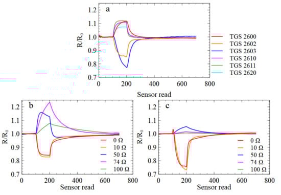 Examples of sensors’ responses to a sample of Rhizoctonia odour. Responses of sensors are displayed in the subfigures as marked: (a) in PW4 e-nose device, (b) in PW6 with TGS2602 sensors and (c) with TGS2603 sensors. The y-axis represents the sensor resistance R relative to the resistance in clean air . The x-axis represents the sensor resistance read number counted from the start of the measurement of the sample. The sensors were read for 1.22 seconds each.